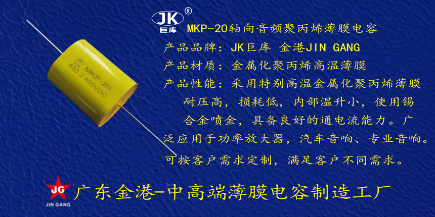産品(pin)品牌 :JK巨(ju)庫金港(gang)JINGANG 産品材(cai)質: 金屬(shǔ)化聚丙(bǐng)烯高溫(wen)薄膜 産(chan)品性能(neng): 采用高(gao)溫金屬(shǔ)化聚丙(bing)烯薄膜(mó) 耐壓高(gao),損耗低(dī),内部溫(wēn)升小,使(shǐ)用錫合(he)金噴金(jīn), 具備良(liang)好的通(tōng)電流能(néng)力。 産品(pin)作用: 廣(guǎng)泛應用(yòng)于功率(lǜ)放大器(qi),汽車音(yin)響、專業(ye)音響。 定(ding)制加工(gōng) :可按客(kè)戶需求(qiu)定制,滿(man)足客戶(hu)不同需(xu)求。
