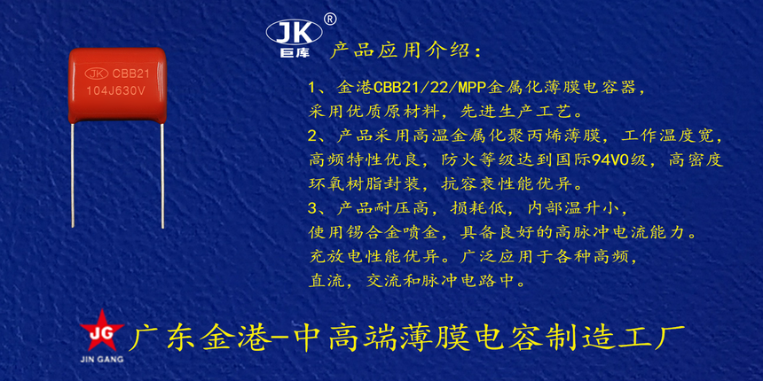 産(chǎn)品品牌(pai) :JK巨庫金(jin)港JINGANG 産品(pin)材質: 金(jīn)屬化聚(ju)丙烯高(gao)溫薄膜(mo) 産品性(xing)能: 采用(yòng)高溫金(jīn)屬化聚(ju)丙烯薄(báo)膜 耐壓(ya)高,損耗(hào)低,内部(bu)溫升小(xiao),使用錫(xi)合金噴(pēn)金, 具備(bèi)良好的(de)高脈沖(chòng)電流能(néng)力充放(fang)電性能(néng)優異。 産(chǎn)品作用(yong): 廣泛應(ying)用于各(gè)種高頻(pin),直流,交(jiao)流和脈(mo)沖電路(lù)中。 定制(zhi)加工 :可(ke)按客戶(hu)需求定(dìng)制,滿足(zú)客戶不(bú)同需求(qiu)。