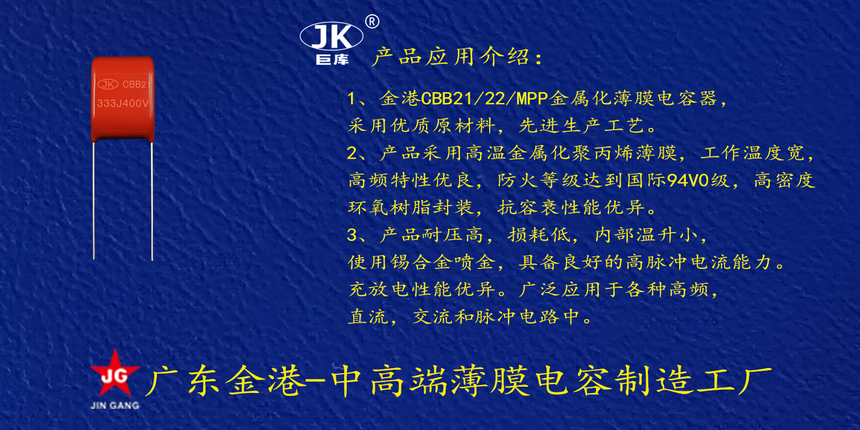 産品品(pǐn)牌 :JK巨庫金港(gang)JINGANG 産品材質: 金(jin)屬化聚丙烯(xi)高溫薄膜 産(chan)品性能: 采用(yong)高溫金屬化(hua)聚丙烯薄膜(mo) 耐壓高,損耗(hào)低,内部溫升(sheng)小,使用錫合(hé)金噴金, 具備(bèi)良好的高脈(mo)沖電流能力(lì)充放電性能(néng)優異。 産品作(zuò)用: 廣泛應用(yong)于各種高頻(pin),直流,交流和(he)脈沖電路中(zhong)。 定制加工 :可(kě)按客戶需求(qiú)定制,滿足客(kè)戶不同需求(qiú)。