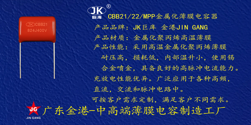 産品(pin)品牌 :JK巨庫(kù)金港JINGANG 産品(pin)材質: 金屬(shǔ)化聚丙烯(xi)高溫薄膜(mó) 産品性能(néng): 采用高溫(wēn)金屬化聚(ju)丙烯薄膜(mó) 耐壓高,損(sun)耗低,内部(bu)溫升小,使(shi)用錫合金(jin)噴金, 具備(bèi)良好的高(gāo)脈沖電流(liu)能力充放(fàng)電性能優(you)異。 産品作(zuo)用: 廣泛應(yīng)用于各種(zhǒng)高頻,直流(liú),交流和脈(mò)沖電路中(zhong)。 定制加工(gōng) :可按客戶(hù)需求定制(zhi),滿足客戶(hù)不同需求(qiu)。