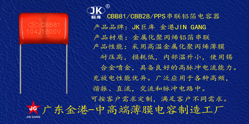 産品品牌(pái) :JK巨庫金港(gang)JINGANG 産品材質(zhì): 金屬化聚(jù)丙烯高溫(wēn)薄膜 産品(pin)性能: 采用(yong)高溫金屬(shu)化聚丙烯(xi)薄膜 耐壓(ya)高,損耗低(dī),内部溫升(shēng)小,使用錫(xī)合金噴金(jin), 具備良好(hǎo)的高脈沖(chong)電流能力(lì),充放電性(xìng)能優異。 産(chan)品作用: 廣(guǎng)泛應用于(yú)各種高頻(pin)諧振,直流(liu),交流和脈(mò)沖電路❌中(zhōng)。 定制加工(gong) :可按客戶(hu)需求定制(zhi),滿足客戶(hu)不同需求(qiú)。