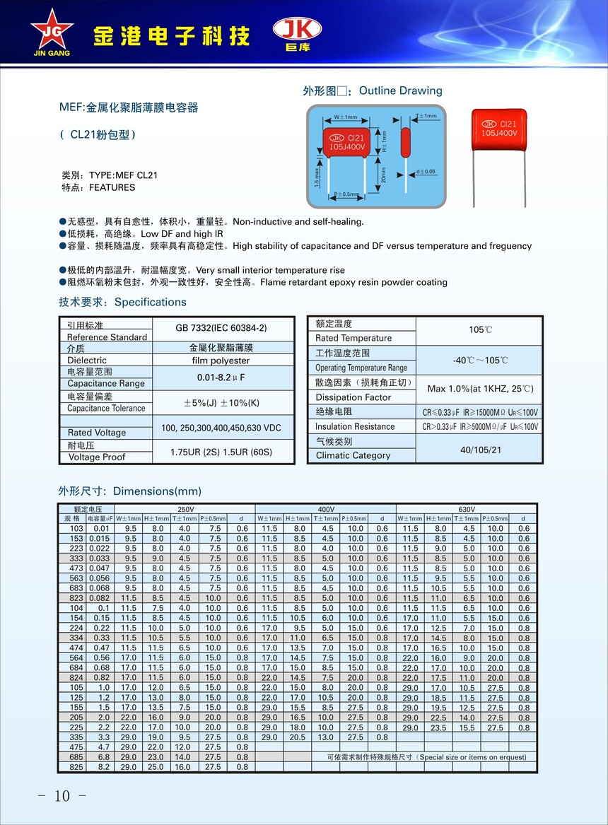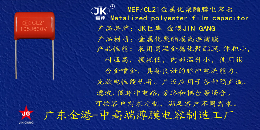 産品品牌(pái) :JK巨庫金港JINGANG 産品材(cai)質: 金屬化聚丙烯(xi)高溫薄膜 産品性(xìng)能: 采用高溫金屬(shu)化聚丙烯薄膜 耐(nai)壓高,損耗低,内部(bù)溫升小,使用錫合(he)金噴金, 具備良好(hǎo)的高脈沖電流能(néng)力,充放電性能優(you)異。 産品作用: 廣泛(fan)應用于各種隔直(zhí)流濾波,低脈沖電(dian)路,旁路和耦🔴合等(deng)場合。 定制加工 :可(ke)按客戶需求定制(zhi),滿足客戶不同需(xu)求。