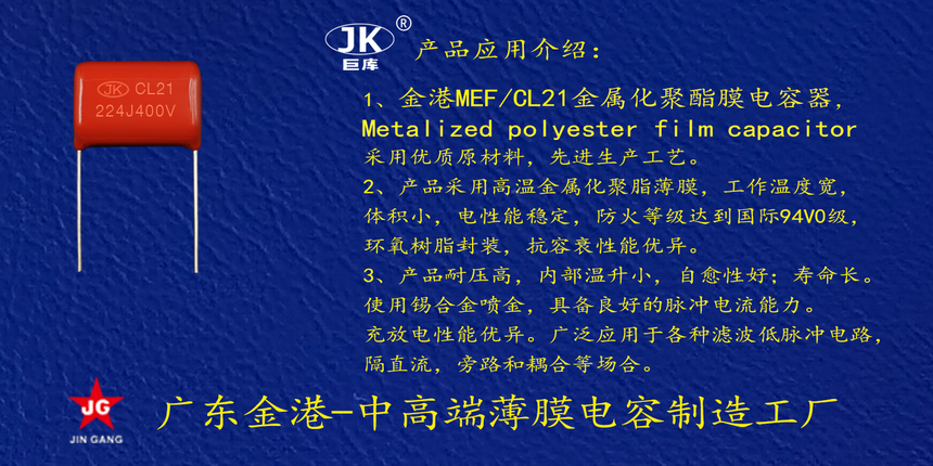 産品品牌(pai) :JK巨庫金港JINGANG 産品材(cai)質: 金屬化聚丙烯(xi)高溫薄膜 産品性(xing)能: 采用高溫金屬(shǔ)化聚丙烯薄膜 耐(nai)壓高,損耗低,内部(bu)溫升小,使用錫合(hé)金噴金, 具備良好(hǎo)的高脈沖電流能(neng)力,充放電性能優(you)異。 産品作用: 廣泛(fàn)應用于各種隔直(zhi)流濾波,低脈沖電(dian)路,旁路和耦🔴合等(děng)場合。 定制加工 :可(ke)按客戶需求定制(zhì),滿足客戶不同需(xu)求。
