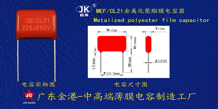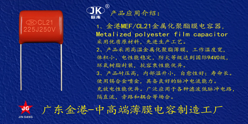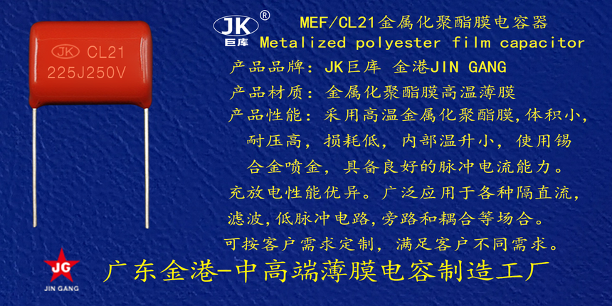 産品(pǐn)品牌 :JK巨(jù)庫金港(gǎng)JINGANG 産品材(cai)質: 金屬(shǔ)化聚丙(bǐng)烯高溫(wēn)薄膜 産(chan)品性能(neng): 采用高(gāo)溫金屬(shu)化聚丙(bǐng)烯薄膜(mo) 耐壓高(gāo),損耗低(di),内部溫(wen)升小,使(shi)用錫合(hé)金噴金(jin), 具備良(liang)好的高(gao)脈沖電(dian)流能力(li),充放電(diàn)性能優(yōu)異。 産品(pin)作用: 廣(guang)泛應用(yong)于各種(zhong)隔直流(liu)濾波,低(dī)脈沖電(diàn)路,旁路(lù)和耦合(he)等場合(hé)。 定制加(jia)工 :可按(an)客戶需(xu)求定制(zhì),滿足客(ke)戶不同(tóng)需求。