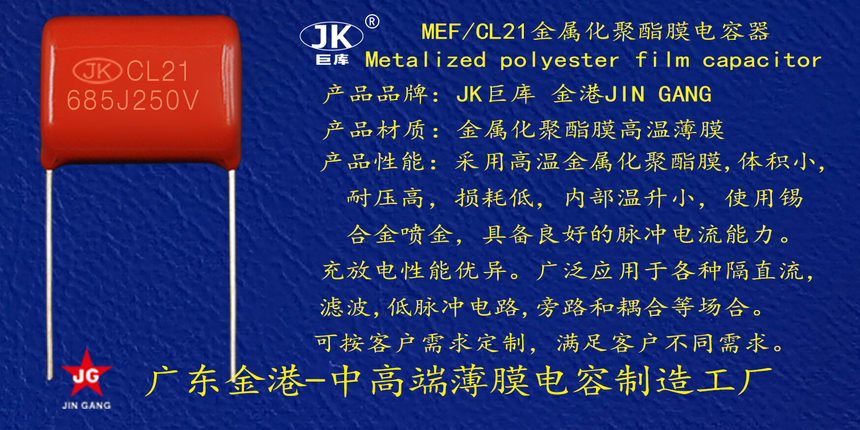 産品品牌(pái) :JK巨庫金港JINGANG 産(chan)品材質: 金屬(shǔ)化聚丙烯高(gao)溫薄膜 産品(pǐn)性能: 采用高(gāo)溫金屬化聚(ju)丙烯薄膜 耐(nài)壓高,損耗低(di),内部溫升小(xiao),使用錫合金(jīn)噴金, 具備良(liáng)好的高脈沖(chòng)電流能力,充(chōng)放電性能優(you)異。 産品作用(yòng): 廣泛應用于(yu)各種隔直流(liú)濾波,低脈沖(chong)電路,旁路和(he)耦🌐合等場合(he)。 定制加工 :可(kě)按客戶需求(qiu)定制,滿足客(kè)戶不同需求(qiú)。
