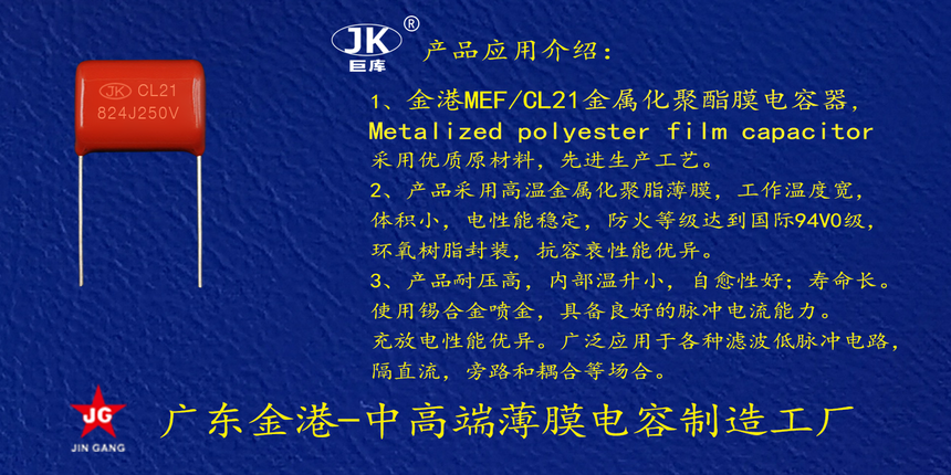 産品品(pǐn)牌 :JK巨庫金(jīn)港JINGANG 産品材(cái)質: 金屬化(huà)聚丙烯高(gāo)溫薄膜 産(chan)品性能: 采(cǎi)用高溫金(jin)屬化聚丙(bing)烯薄膜 耐(nài)壓高,損耗(hao)低,内部溫(wēn)升小,使用(yong)錫合金噴(pen)金, 具備良(liáng)好的高脈(mò)沖電流能(neng)力,充放電(dian)性能優異(yì)。 産品作用(yòng): 廣泛應用(yong)于各種隔(gé)直流濾波(bo),低脈沖電(dian)路,旁路和(hé)耦合等場(chǎng)合。 定制加(jia)工 :可按客(ke)戶需求定(dìng)制,滿足客(ke)戶不同需(xū)求。