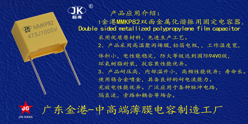 産(chan)品品牌 :JK巨(jù)庫金港JINGANG 産(chǎn)品材質: 雙(shuang)面金屬化(hua)聚丙烯,塑(sù)料外殼封(feng)裝 産品性(xing)能: 采用高(gao)溫雙面化(huà)聚丙烯,耐(nai)壓高, 損耗(hào)低,高頻條(tiao)件下内部(bù)溫升小。錫(xī)合金噴金(jīn), 具備良好(hǎo)的耐電流(liu)能力。充放(fang)電性能優(yōu)異。 産品作(zuo)用: 應用于(yú)高壓高頻(pín)脈沖電路(lù),諧振電路(lu),等場合。