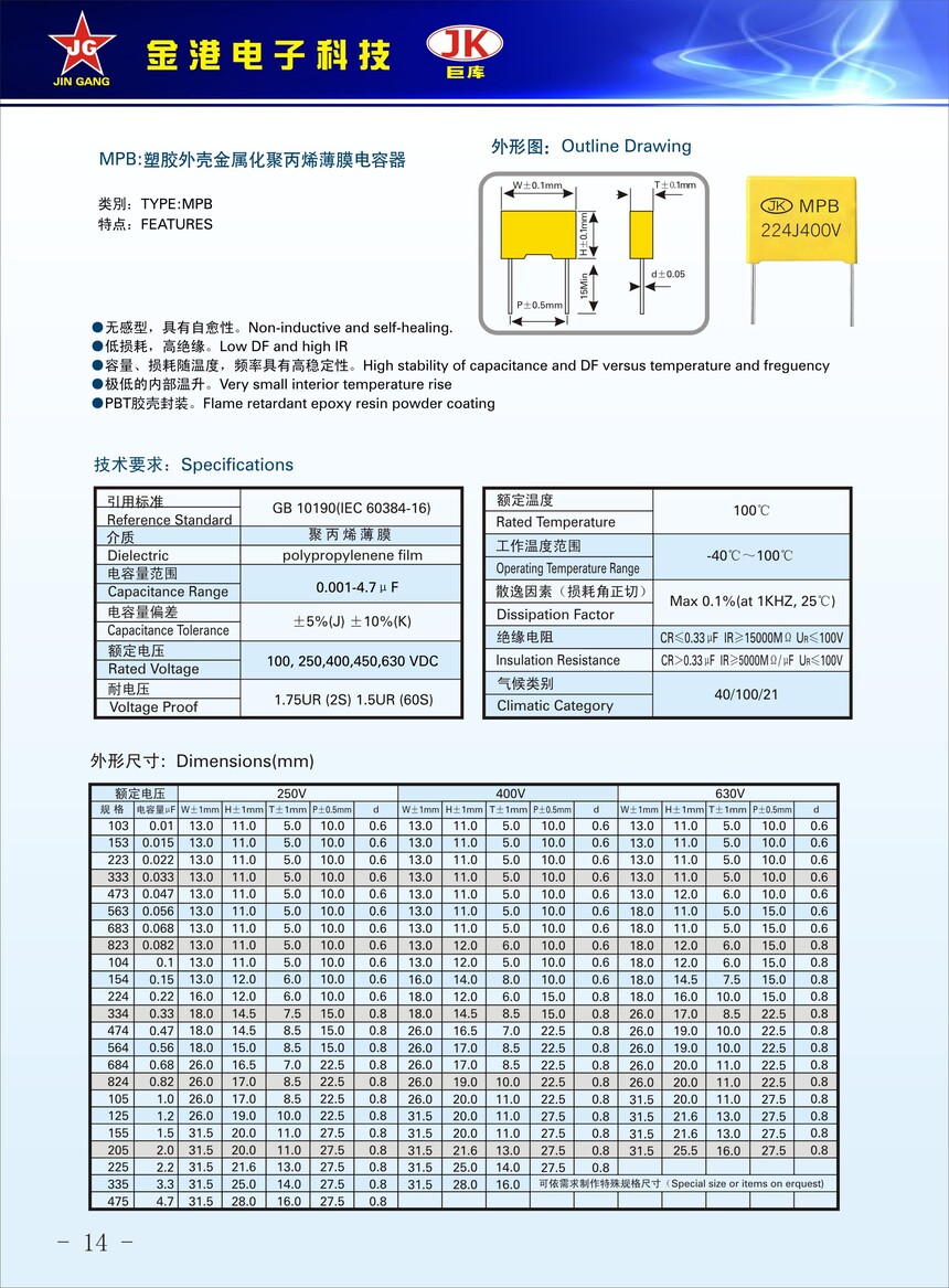産品品牌(pái) :JK巨庫金港JINGANG 産品(pǐn)材質: 高溫金屬(shu)化聚丙烯,塑料(liào)外殼封裝 産品(pin)性能: 采用高溫(wēn)金屬化聚丙烯(xi),耐壓高産品一(yi)緻性好, 損耗低(dī),内部溫升小。錫(xi)合金噴金, 具備(bèi)良好的耐電流(liú)能力。充放電性(xìng)能優異。 産品作(zuò)用: 應用于高壓(ya)高頻脈沖電路(lù),諧振電路,等場(chǎng)合。