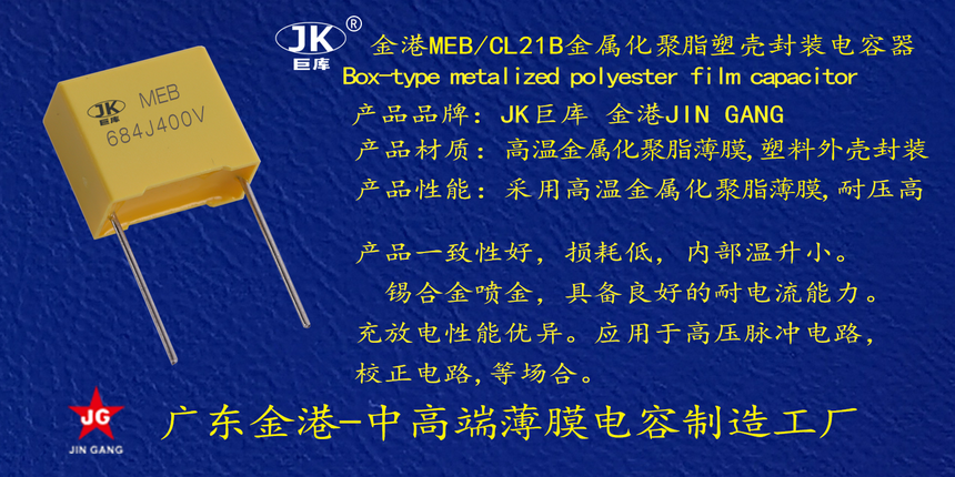 産品品(pin)牌 :JK巨庫金港(gǎng)JINGANG 産品材質: 高(gao)溫金屬化聚(jù)脂薄膜,塑料(liào)外殼封裝 産(chǎn)品性能: 采用(yong)高溫金屬化(huà)聚脂薄膜,耐(nài)壓高